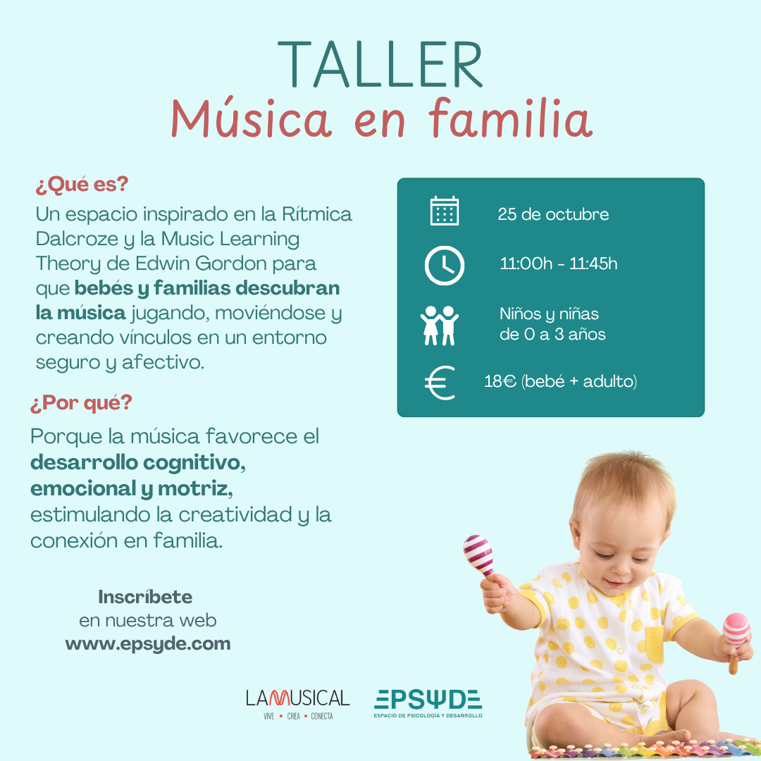 🗓 25 de octubre de 2025 – 11.00h | ⏰ 45 mnts | 👶🏻 0-3 años 📍 EPSYDE Paseo Teruel 32-34 , local 2. Zaragoza 💶 18 euros adulto + bebé COMPLETO La música es un lenguaje universal que nos conecta desde los primeros meses de vida. Por eso, en Epsyde hemos creado el Taller […]